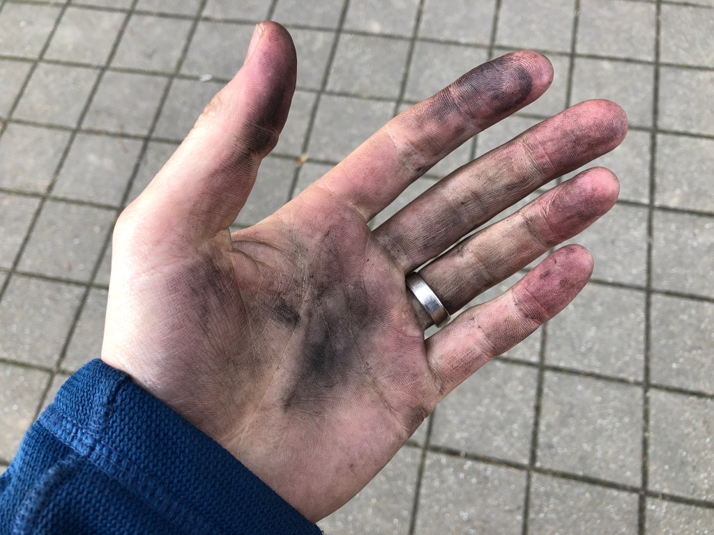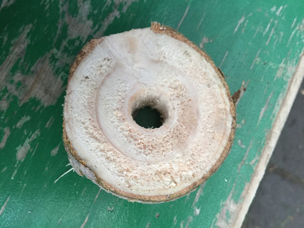 It’s time to get the bow saw out. Measure 2cm from the end of your thick log and make a mark. Try to cut as straight as possible as this will ensure your disc is even and not heavier on one side than the other. The photo above shows the good, the bad and the ugly when it comes to disc cutting.