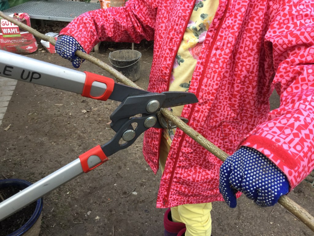 Loppers crash course: using loppers involves two people. One person is the boss and the other does as they’re told. The person holding the loppers is the boss. The other person holds the stick in front of them like a set of handlebars from a bike. The boss then moves the loppers into position and makes the cut. Accuracy becomes difficult if both people move the thing that they’re holding.